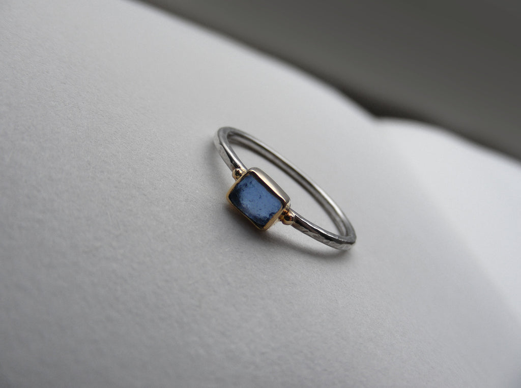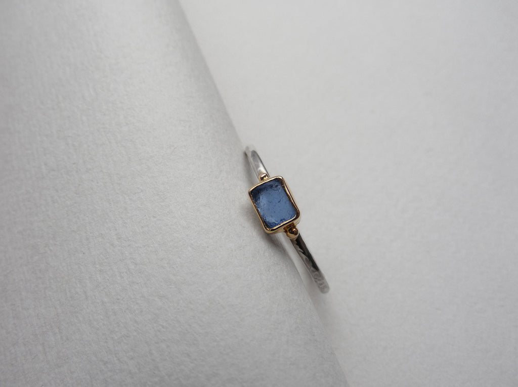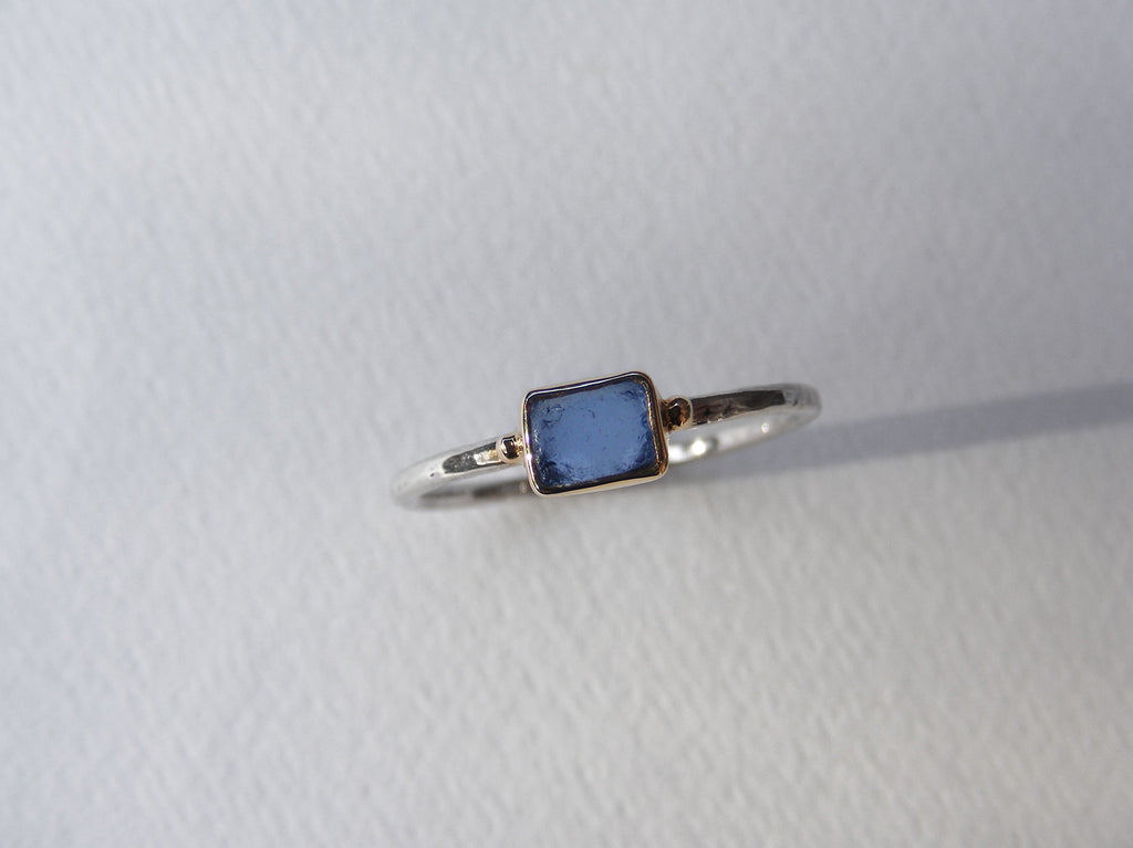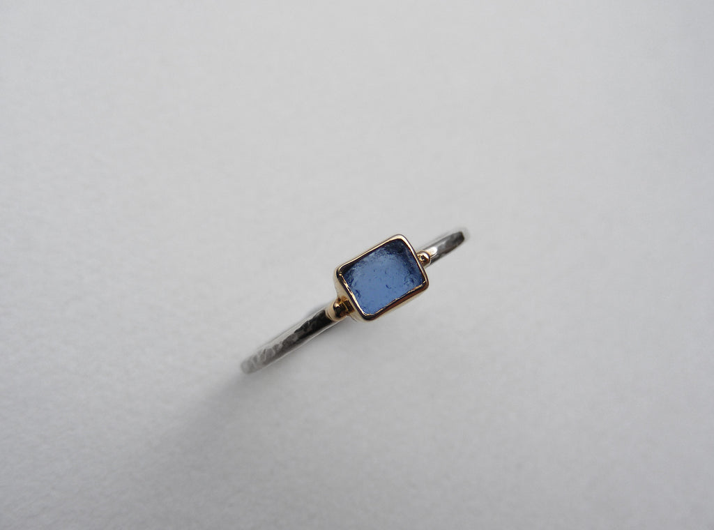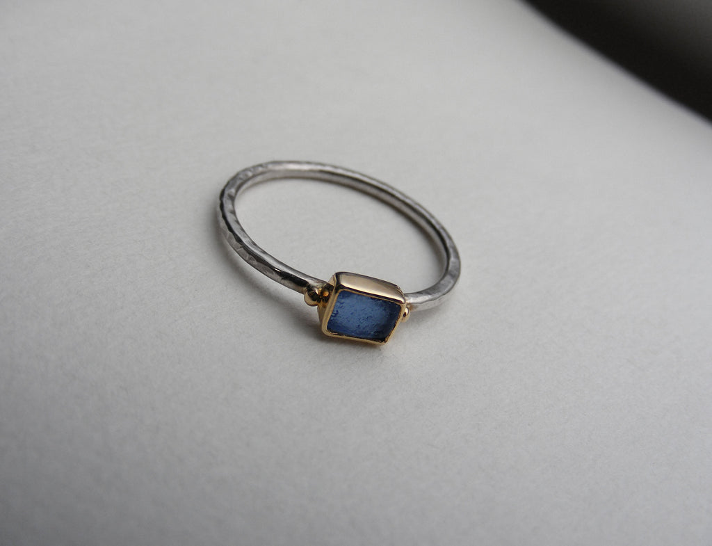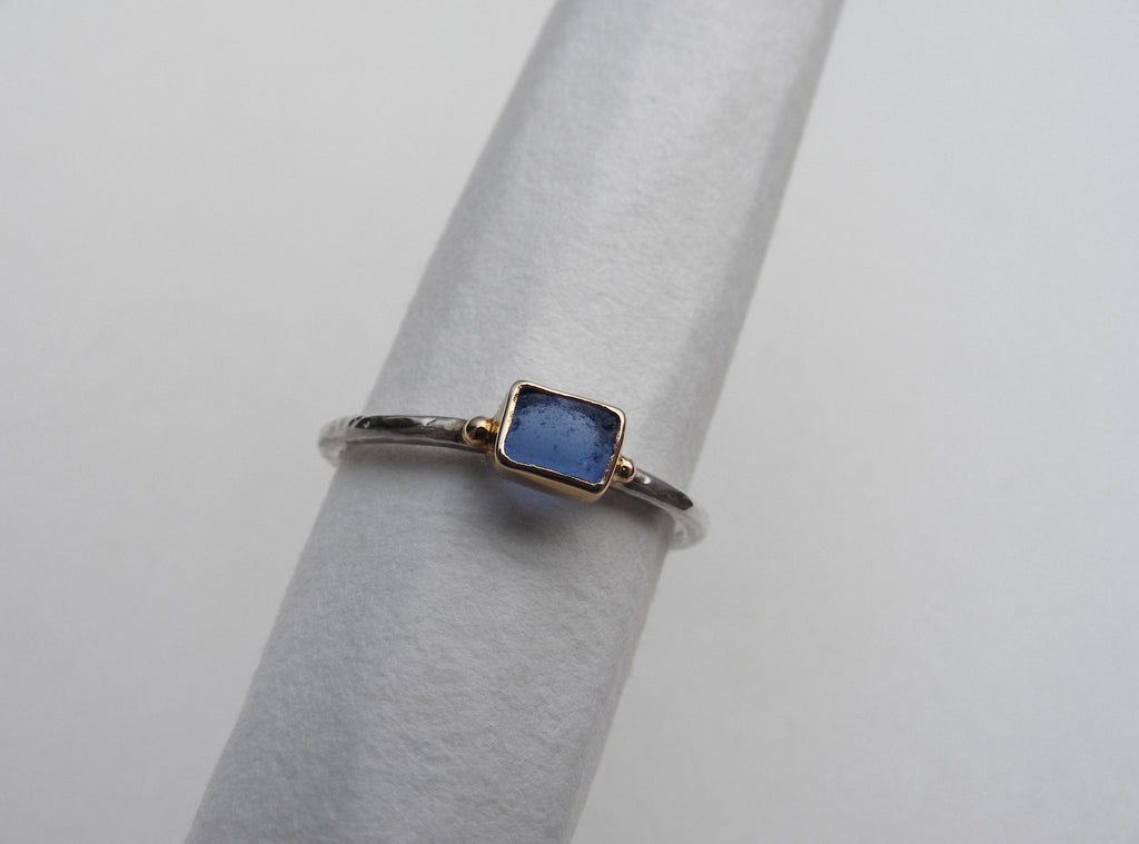 Bristol blue Radient shaped sea glass treasure ring made using recycled 9ct gold bezel and recycled silver, 1.5mm hammered shank with gold nuggets.