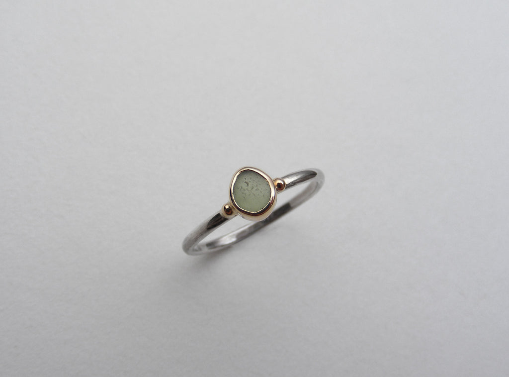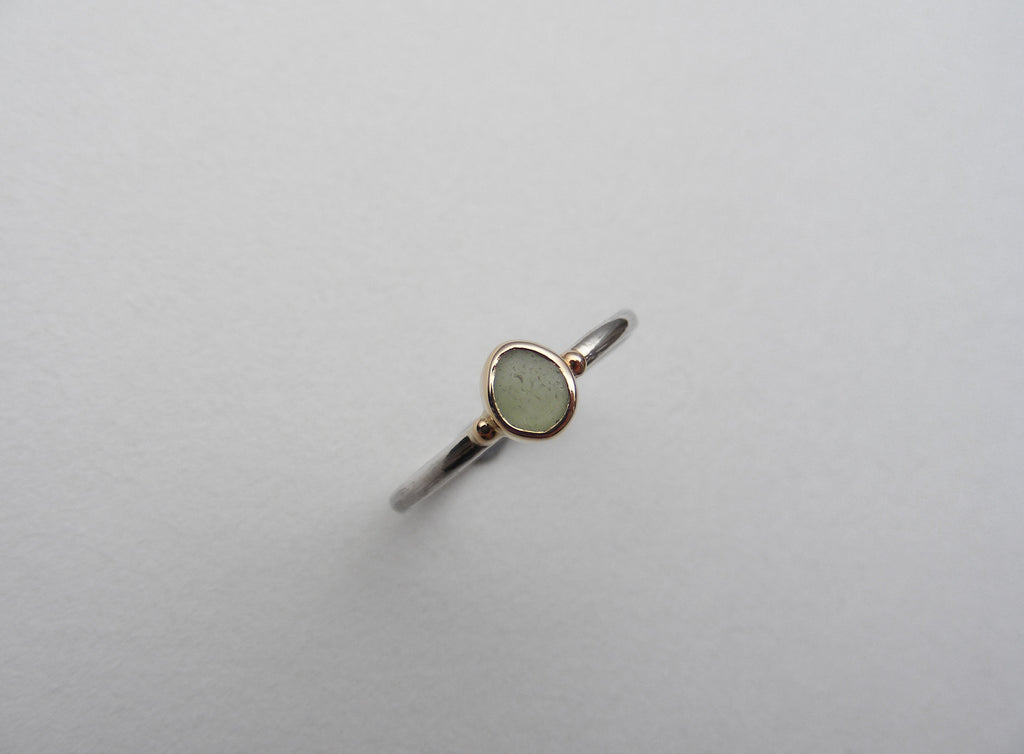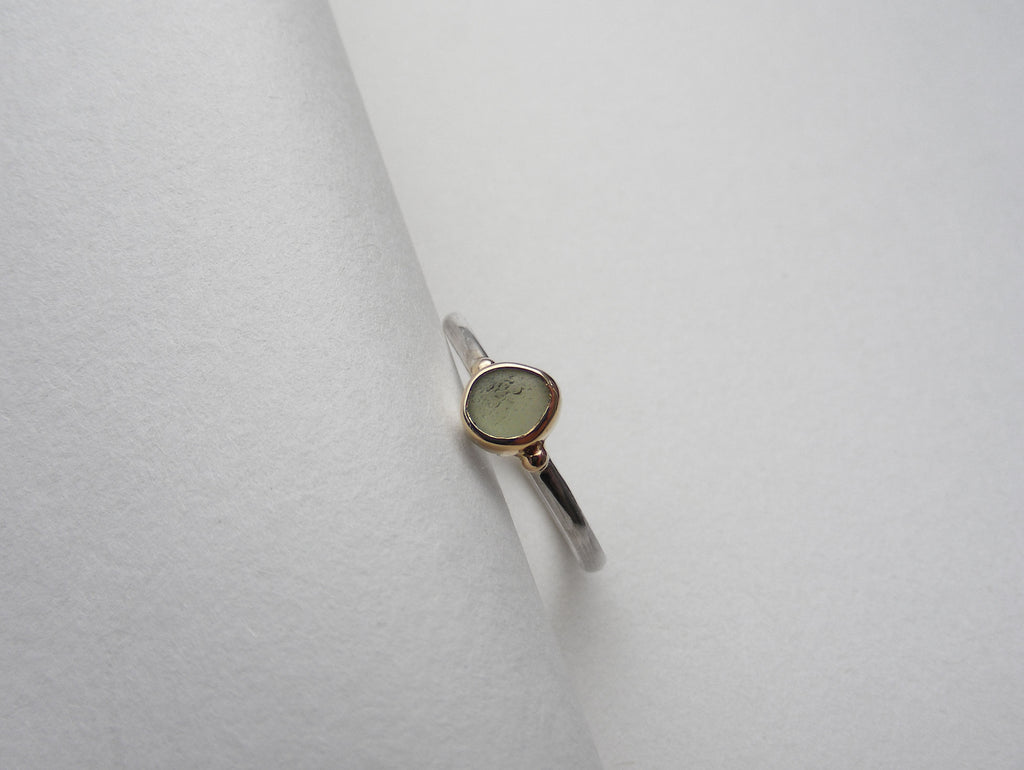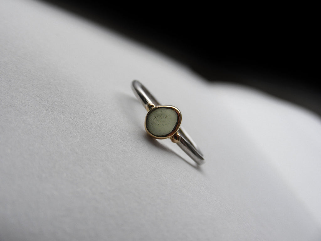 Olive green, round pear shaped sea glass treasure ring made using recycled 9ct gold bezel and recycled silver, 1.5mm shiny shank with gold nuggets.